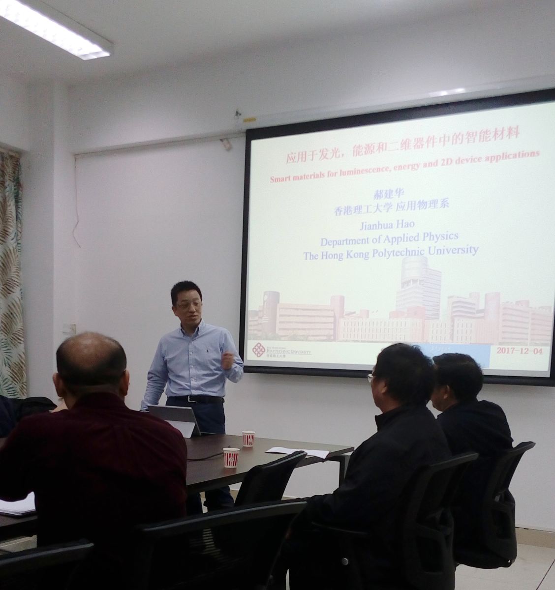 12月4日上午,香港理工大学应用物理学系副主任和研究委员会主席郝建华教授应邀到材能学院做题目为《应用于发光,能源和二维器件中的智能材料》的学术讲座。讲座在工学三号馆221室举行,材能学院部分老师和研究生参加了本次讲座。