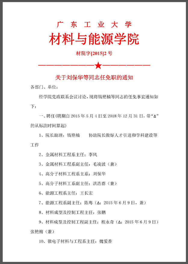 院字2015年1号(关于材料与能源学院领导班子分工及联系单位的决定)