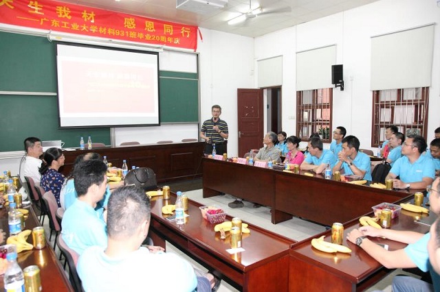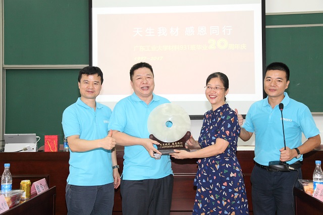 “天生我材,感恩同行。” 7月8日上午,广东工业大学材料931班校友在东风路校区举办毕业20周年纪念活动。怀着激动、喜悦与感恩的心情,30多位校友从全国各地和海外回来母校,副校长陈卓武老师、校工会常务副主席翁专老师、原班主任肖寅昕老师、材料与能源学院党委英健文副书记、蔡英儿、李风等老师出席了校友活动。师生久别重逢,执手言欢,漫步校园,并在原来学习所在系楼(三号楼)举行了别开生面的师生座谈会,一起追忆友谊,感念师恩。 座谈会上,陈卓武副校长首先为本次纪念活动热情致辞,向返校活动的校友们表示热烈的欢迎,并介绍了母校近年来的长足发展,作为校友当年的师长,他深情回忆起当年一起走过的日子,共同见证材料931班的同学们从军训“钢七连”到学习“先进班”,从毛头愣小子到行业翘楚、职场精英和成功创业者的真实故事,师生之间亦师亦友,严爱有加,勾起了无尽的回忆与畅想;当年的系党总支书记翁专老师、班主任肖寅昕老师以及蔡英儿老师、专业英语的任课老师李风也一一送上了浓浓的祝福;学院党委英健文副书记介绍了学院学科专业的发展情况,并向校友们表达了良好祝愿;校友们也纷纷发表感言,向一起奋斗的青春致敬,向敬爱的母校老师致以由衷谢意和祝福。大家欣喜于学校的跨越发展,感激于领导老师们的栽培关爱,师恩情重,同窗谊浓,其乐融融。 最后,材料931班的校友代表向学院赠送了纪念品,并与老师们一起合影留念。