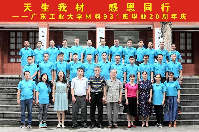 “天生我材,感恩同行。” 7月8日上午,广东工业大学材料931班校友在东风路校区举办毕业20周年纪念活动。怀着激动、喜悦与感恩的心情,30多位校友从全国各地和海外回来母校,副校长陈卓武老师、校工会常务副主席翁专老师、原班主任肖寅昕老师、材料与能源学院党委英健文副书记、蔡英儿、李风等老师出席了校友活动。师生久别重逢,执手言欢,漫步校园,并在原来学习所在系楼(三号楼)举行了别开生面的师生座谈会,一起追忆友谊,感念师恩。 座谈会上,陈卓武副校长首先为本次纪念活动热情致辞,向返校活动的校友们表示热烈的欢迎,并介绍了母校近年来的长足发展,作为校友当年的师长,他深情回忆起当年一起走过的日子,共同见证材料931班的同学们从军训“钢七连”到学习“先进班”,从毛头愣小子到行业翘楚、职场精英和成功创业者的真实故事,师生之间亦师亦友,严爱有加,勾起了无尽的回忆与畅想;当年的系党总支书记翁专老师、班主任肖寅昕老师以及蔡英儿老师、专业英语的任课老师李风也一一送上了浓浓的祝福;学院党委英健文副书记介绍了学院学科专业的发展情况,并向校友们表达了良好祝愿;校友们也纷纷发表感言,向一起奋斗的青春致敬,向敬爱的母校老师致以由衷谢意和祝福。大家欣喜于学校的跨越发展,感激于领导老师们的栽培关爱,师恩情重,同窗谊浓,其乐融融。 最后,材料931班的校友代表向学院赠送了纪念品,并与老师们一起合影留念。